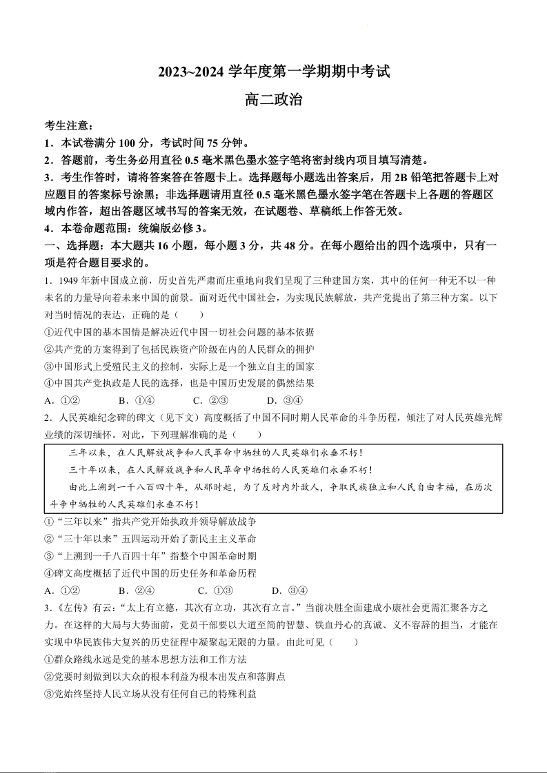 甘肃省酒泉市四校2023-2024学年高二上学期期中联考试题政治+答案