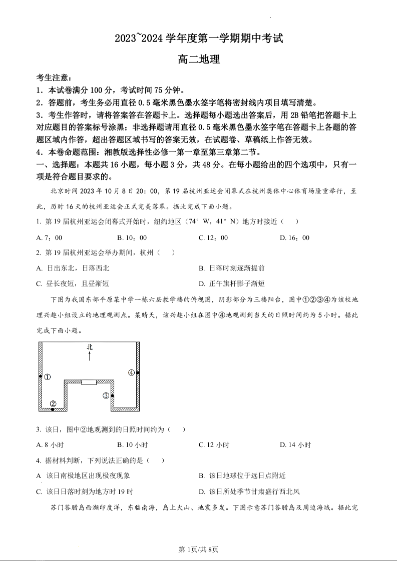 甘肃省酒泉市四校2023-2024学年高二上学期期中联考试题地理(原卷版)