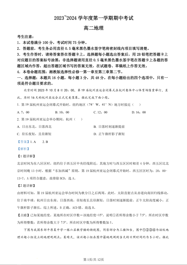 甘肃省酒泉市四校2023-2024学年高二上学期期中联考试题地理(精品解析版)