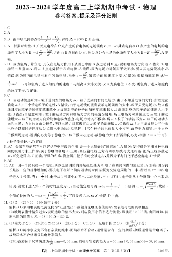 广东省深圳市校际联盟2023-2024学年高二上学期11月期中考试 物理答案