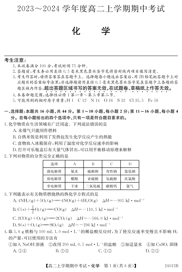 广东省深圳市校际联盟2023-2024学年高二上学期11月期中考试 化学