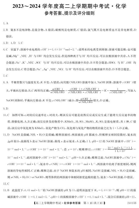 广东省深圳市校际联盟2023-2024学年高二上学期11月期中考试 化学答案