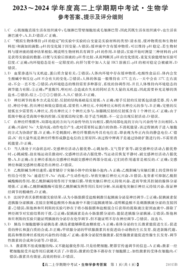 广东省深圳市校际联盟2023-2024学年高二上学期11月期中考试 生物答案