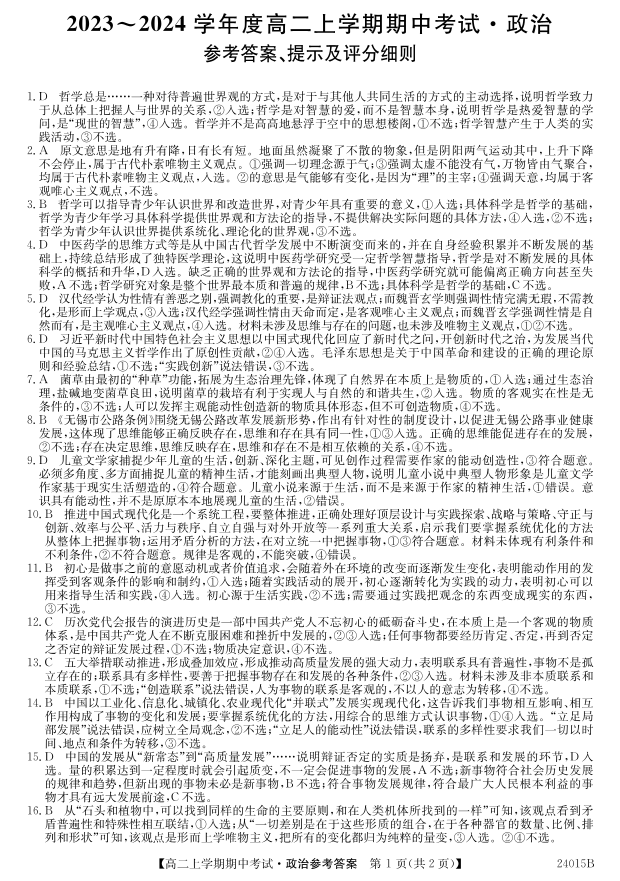 广东省深圳市校际联盟2023-2024学年高二上学期11月期中考试 政治答案