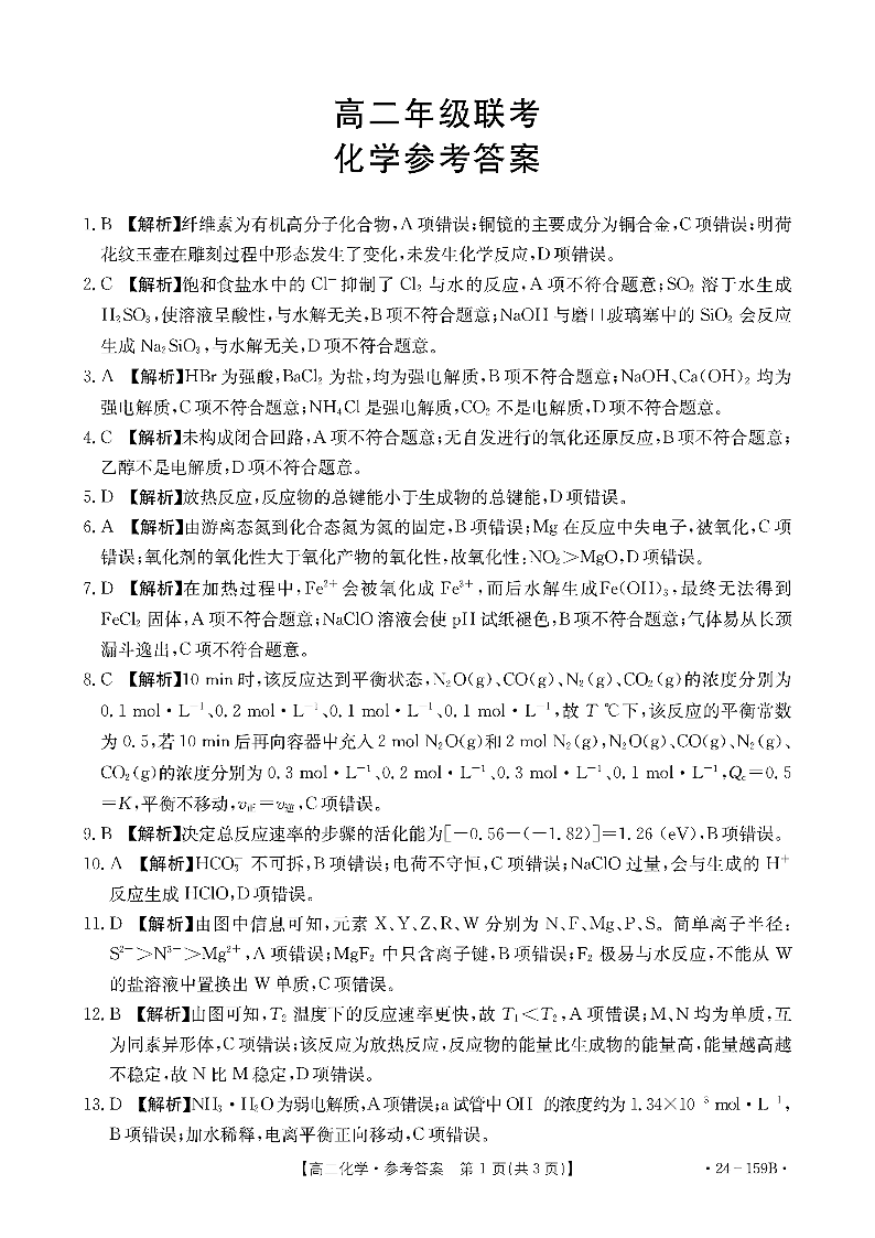 贵州省部分高中学校2023-2024学年高二上学期第二次联考试卷化学答案