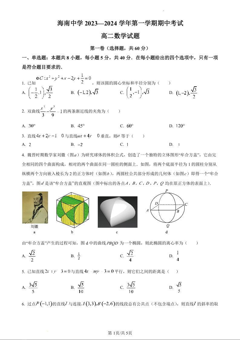 海南省海口市海南中学2023-2024学年上学期高二段考试题数学(原卷版)