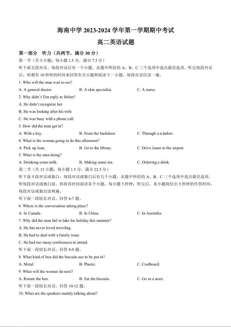 海南省海口市海南中学2023-2024学年上学期高二段考试题英语+答案