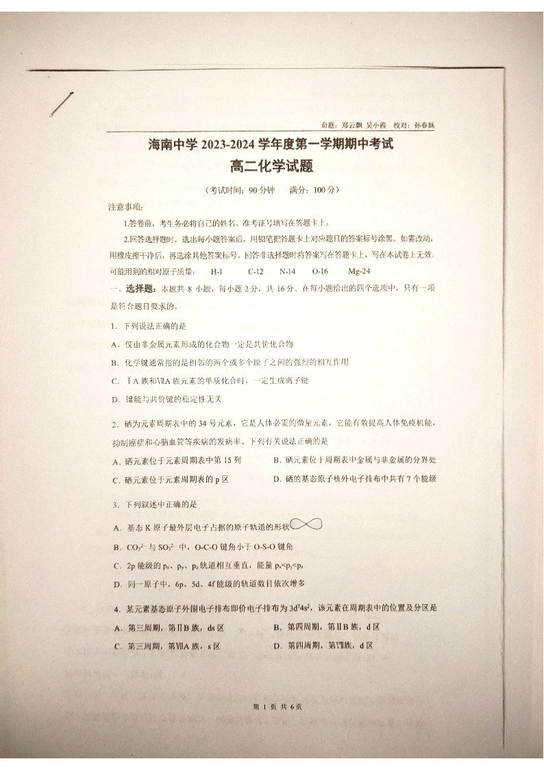 海南省海口市海南中学2023-2024学年上学期高二段考试题化学