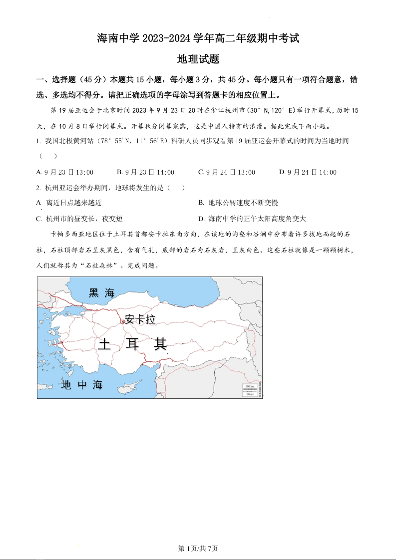 海南省海口市海南中学2023-2024学年上学期高二段考试题地理(原卷版)