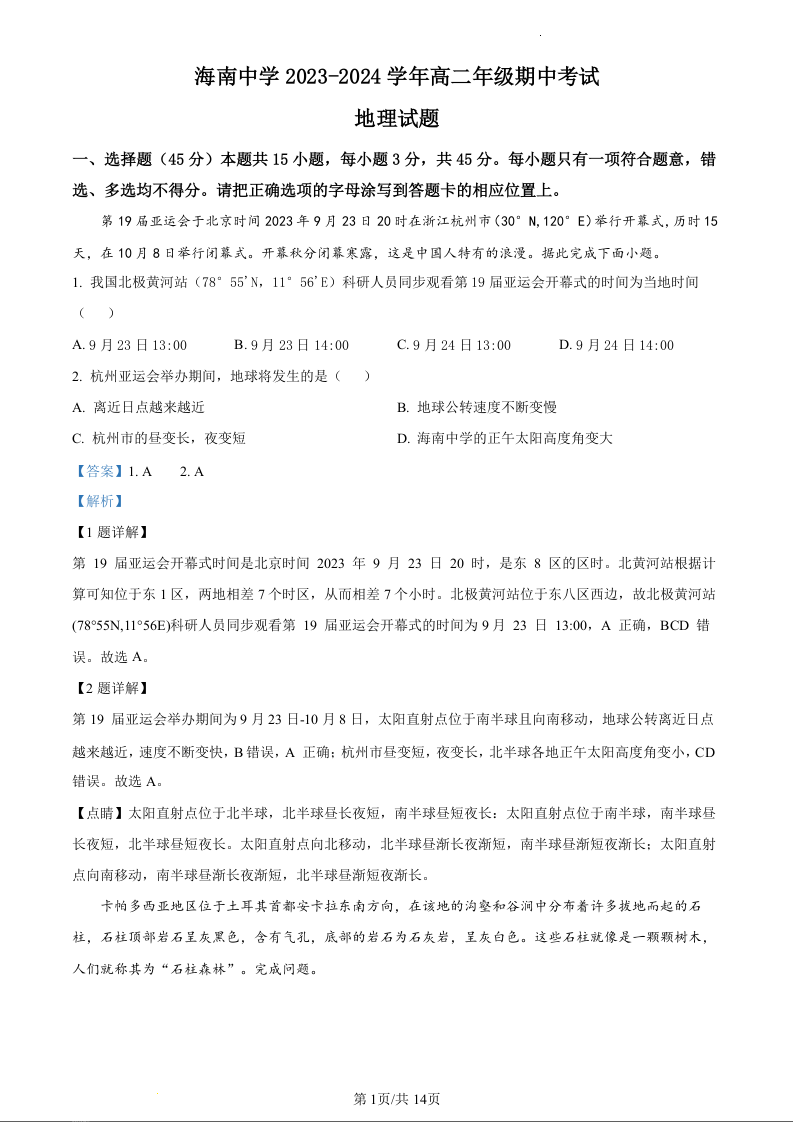 海南省海口市海南中学2023-2024学年上学期高二段考试题地理(精品解析版)