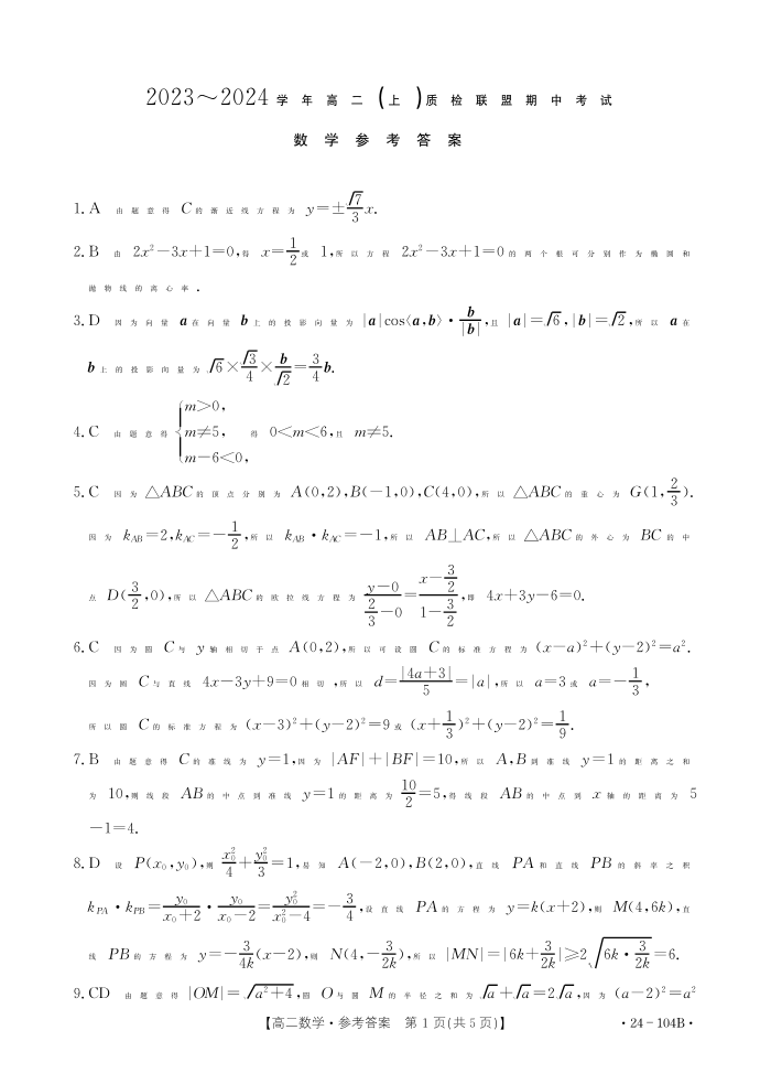 河北省邢台市五校质检联盟2023-2024学年高二上学期11月期中试题数学答案