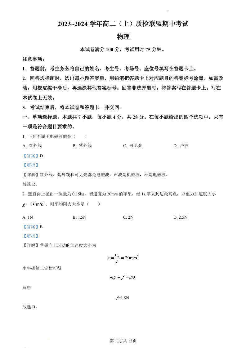 河北省邢台市五校质检联盟2023-2024学年高二上学期11月期中试题物理(精品解析版)