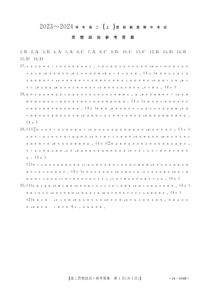 河北省邢台市五校质检联盟2023-2024学年高二上学期11月期中试题政治答案