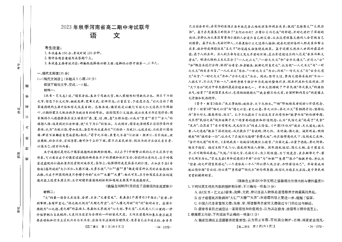 河南省部分名校2023-2024学年高二上学期11月期中考试试题语文