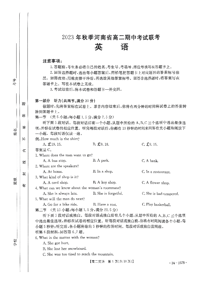 河南省部分名校2023-2024学年高二上学期11月期中考试试题英语