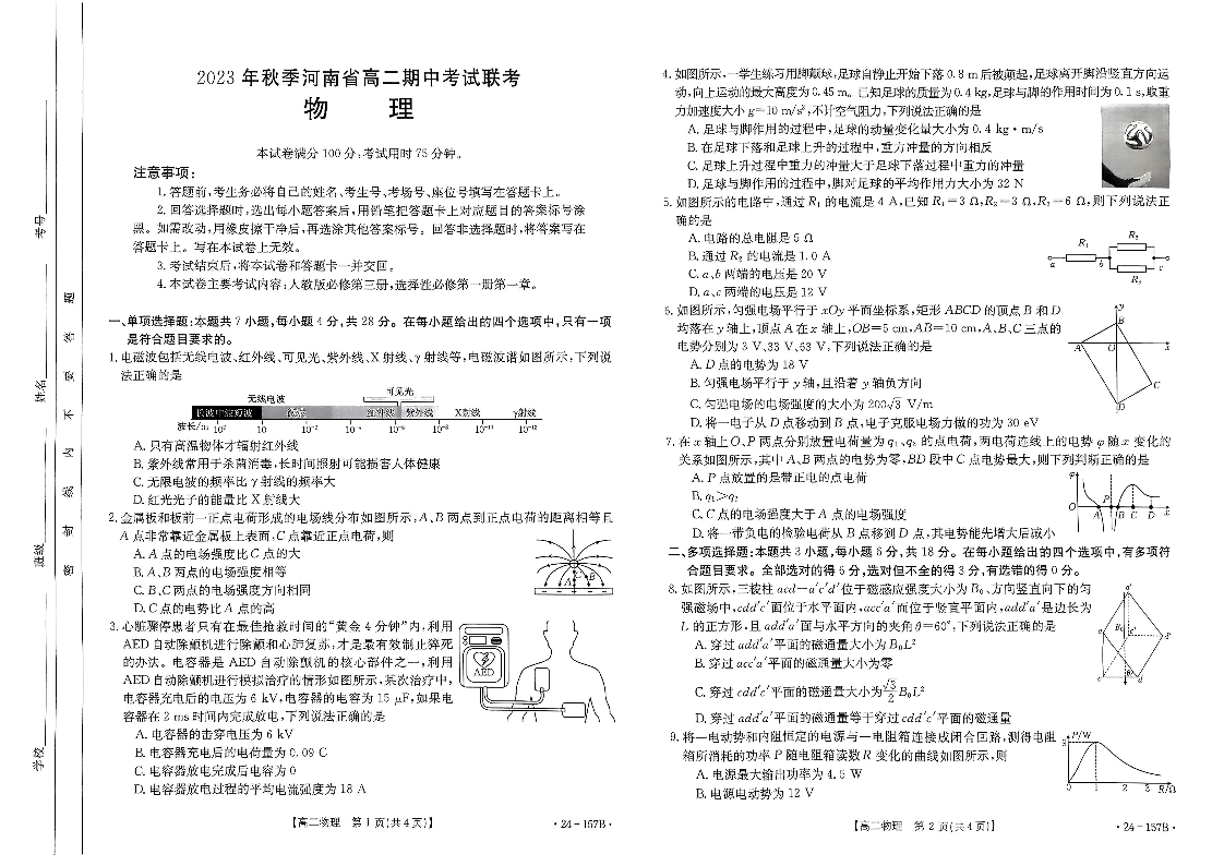 河南省部分名校2023-2024学年高二上学期11月期中考试试题物理