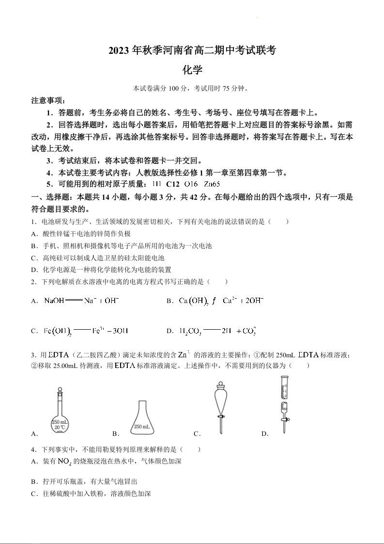 河南省部分名校2023-2024学年高二上学期11月期中考试试题化学