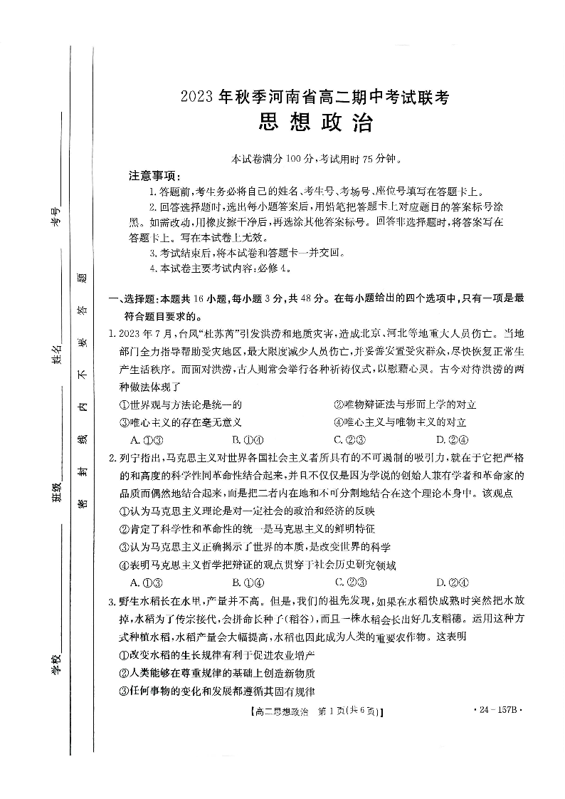 河南省部分名校2023-2024学年高二上学期11月期中考试试题政治