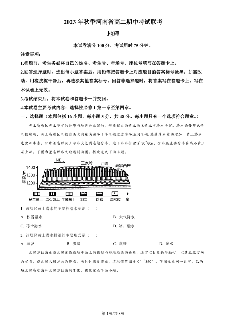 河南省部分名校2023-2024学年高二上学期11月期中考试试题地理(原卷版)