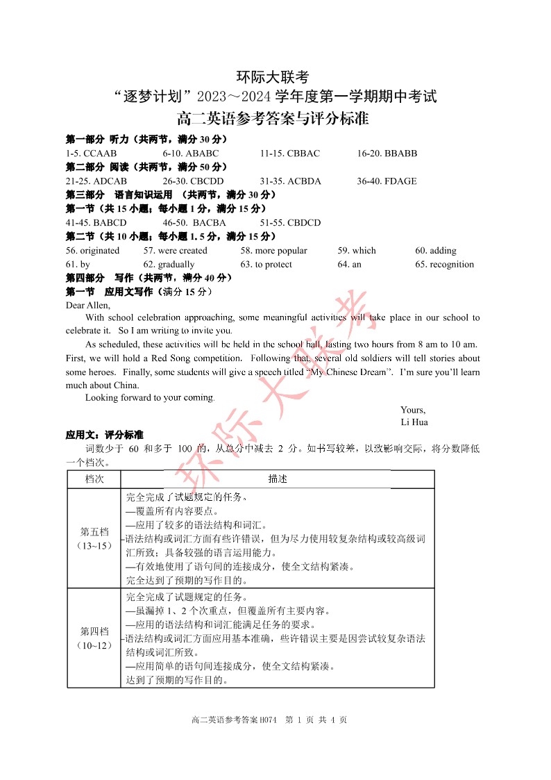 河南省环际大联考“逐梦计划”2023-2024学年高二上学期期中考试英语答案