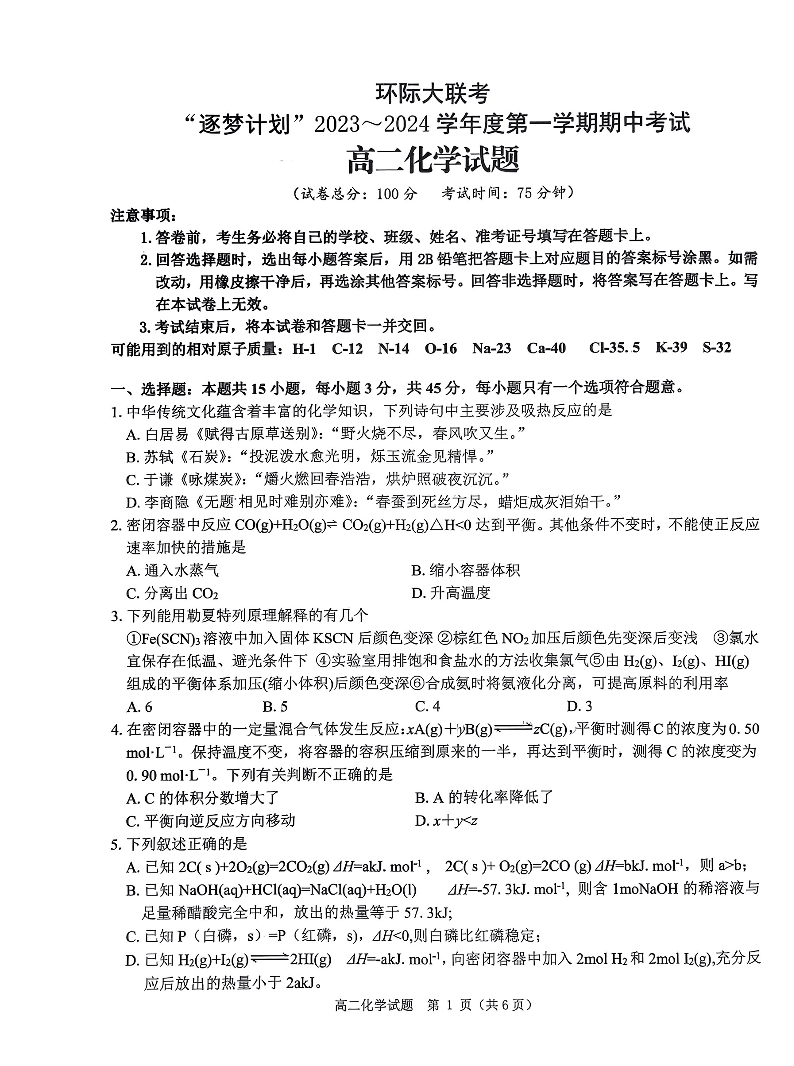 河南省环际大联考“逐梦计划”2023-2024学年高二上学期期中考试化学