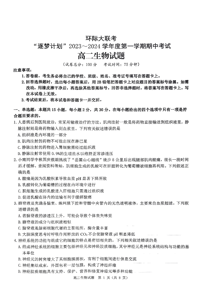 河南省环际大联考“逐梦计划”2023-2024学年高二上学期期中考试生物