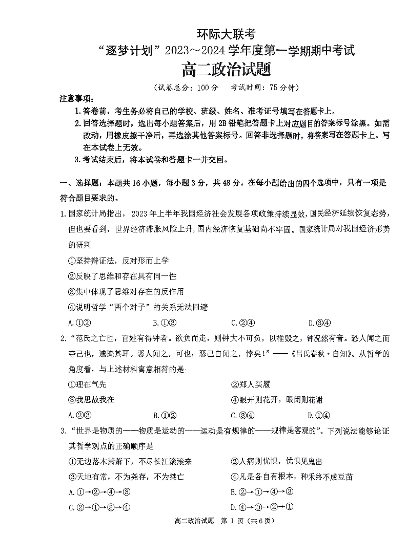 河南省环际大联考“逐梦计划”2023-2024学年高二上学期期中考试政治