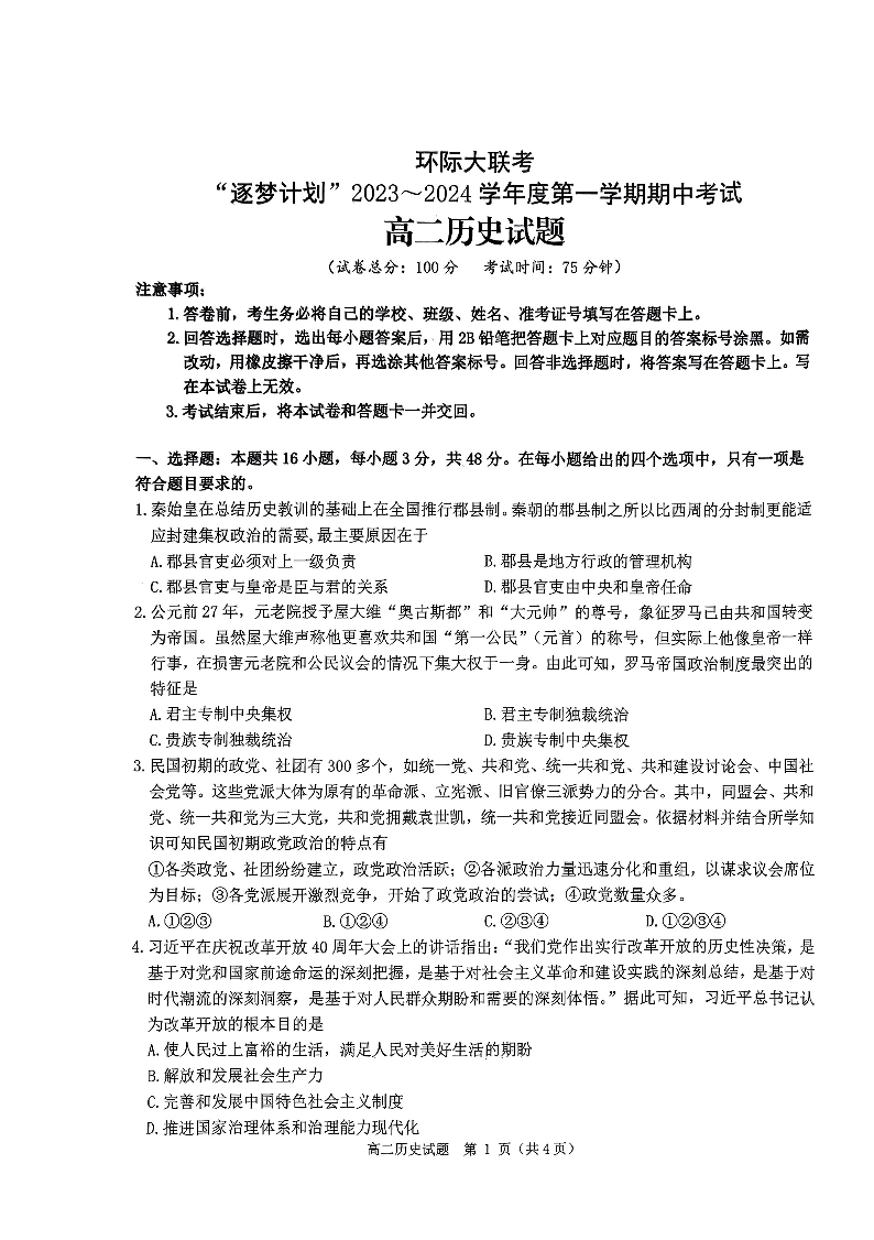 河南省环际大联考“逐梦计划”2023-2024学年高二上学期期中考试历史