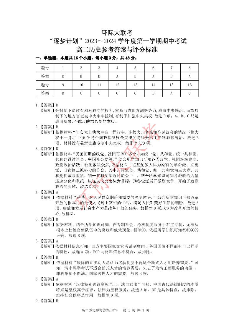 河南省环际大联考“逐梦计划”2023-2024学年高二上学期期中考试历史答案