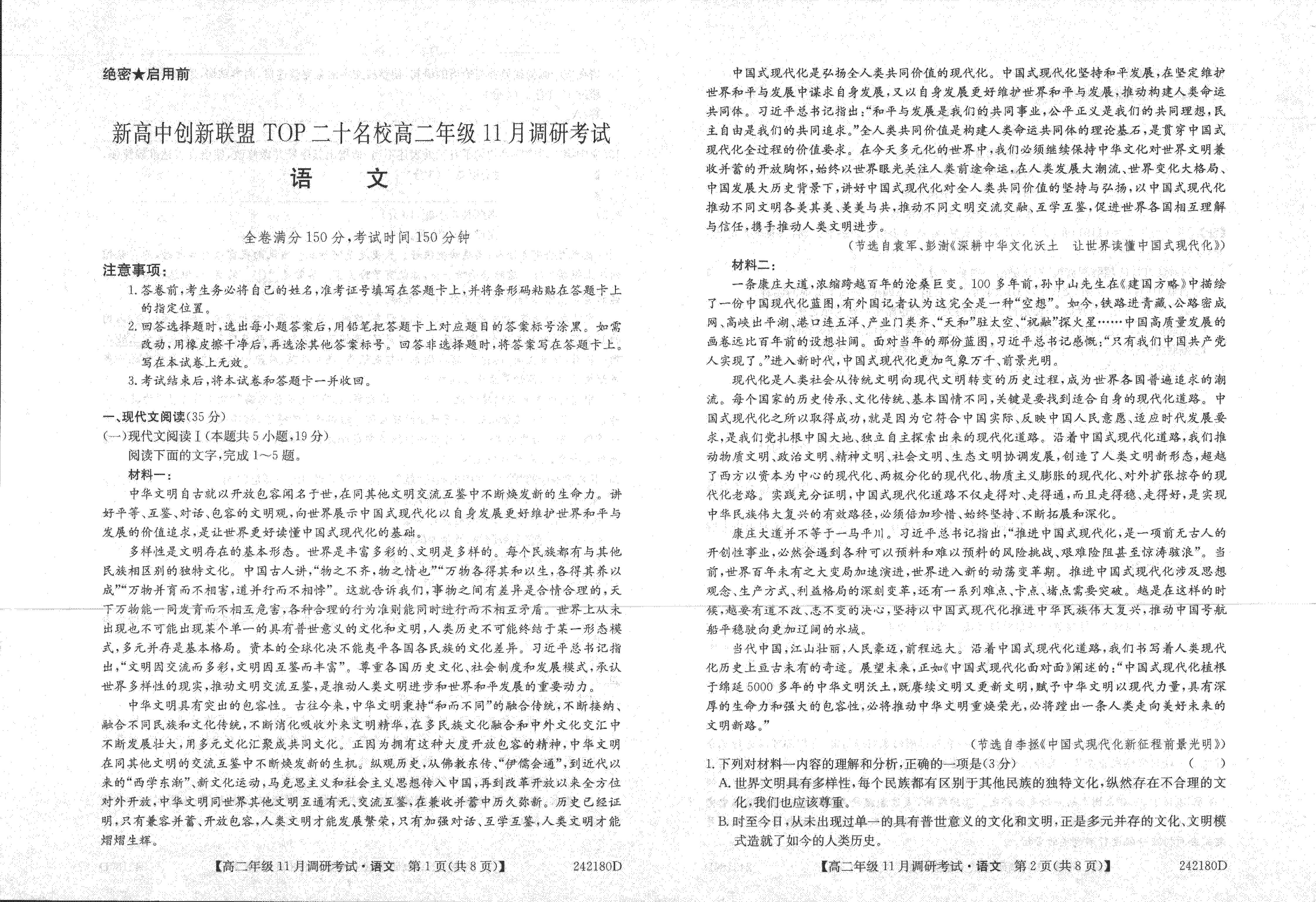 河南省新高中创新联盟TOP二十名校2023-2024学年高二上学期11月调研考试 语文