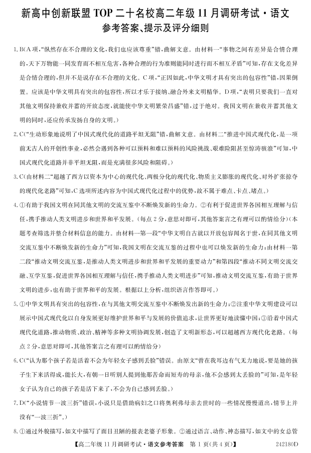 河南省新高中创新联盟TOP二十名校2023-2024学年高二上学期11月调研考试 语文答案
