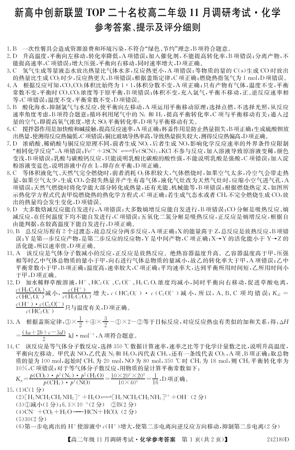 河南省新高中创新联盟TOP二十名校2023-2024学年高二上学期11月调研考试 化学答案