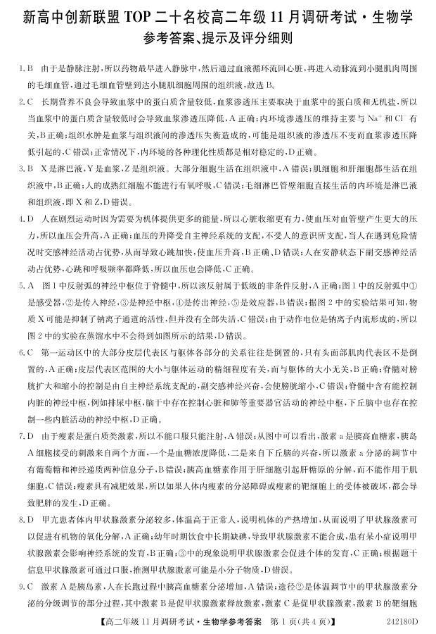 河南省新高中创新联盟TOP二十名校2023-2024学年高二上学期11月调研考试 生物答案