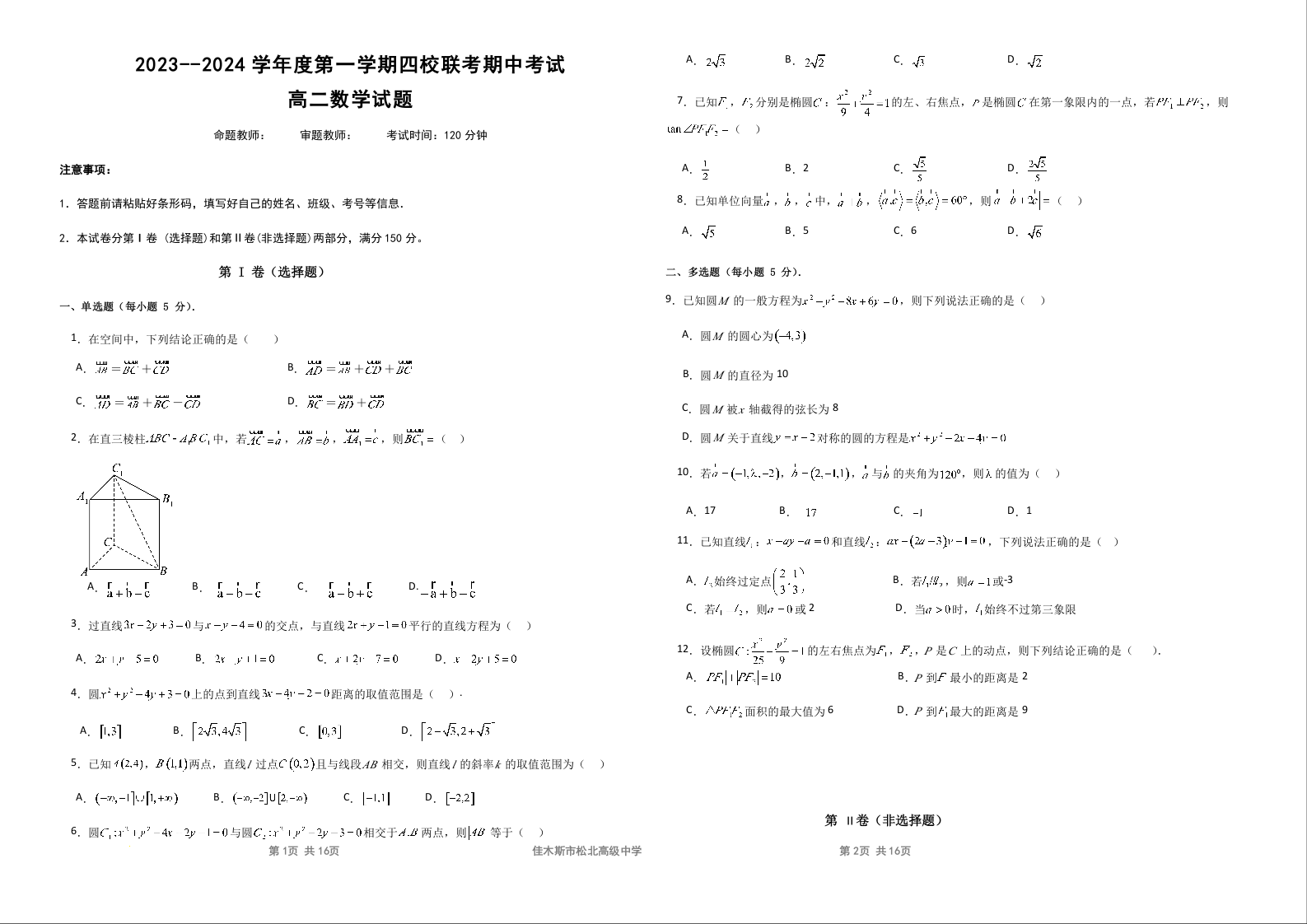 黑龙江省佳木斯市四校2023-2024学年高二上学期期中联考试题数学+答案