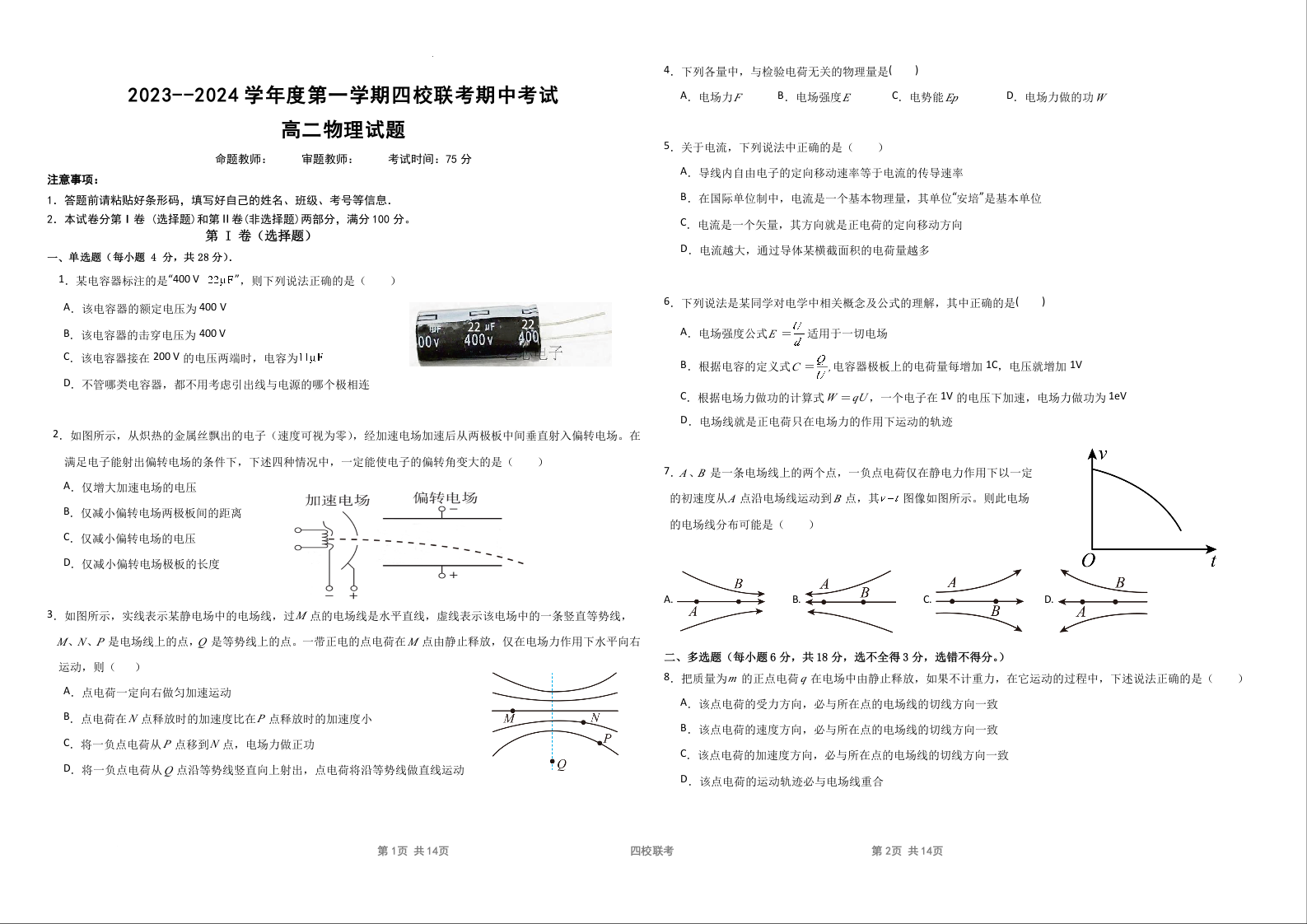 黑龙江省佳木斯市四校2023-2024学年高二上学期期中联考试题物理+答案