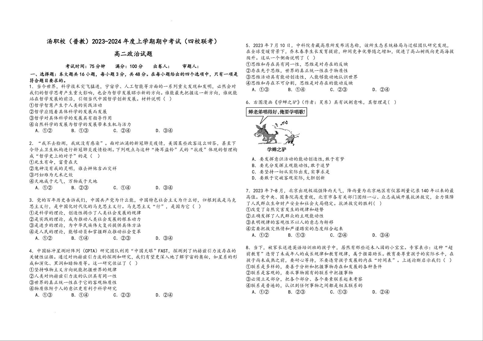 黑龙江省佳木斯市四校2023-2024学年高二上学期期中联考试题政治+答案