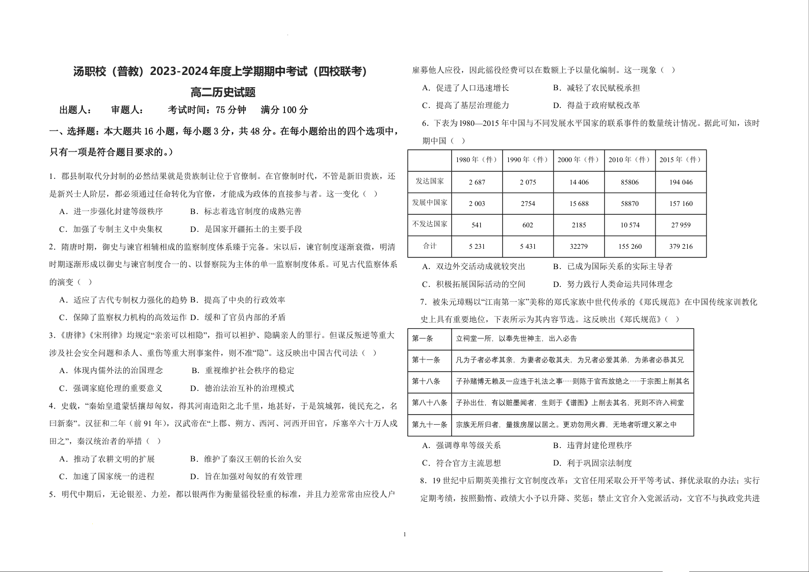 黑龙江省佳木斯市四校2023-2024学年高二上学期期中联考试题历史+答案