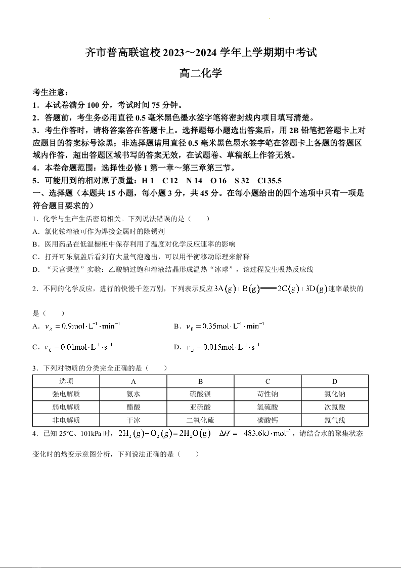 黑龙江省齐齐哈尔市普高联谊校2023-2024学年高二上学期10月期中考试试题化学+答案