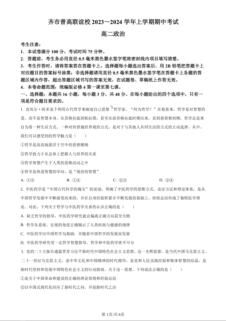 黑龙江省齐齐哈尔市普高联谊校2023-2024学年高二上学期10月期中考试试题政治(原卷版)