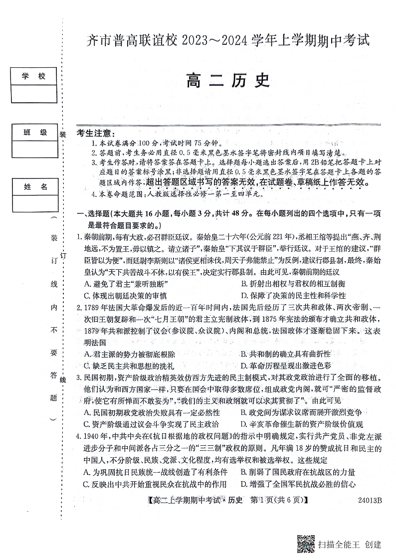 黑龙江省齐齐哈尔市普高联谊校2023-2024学年高二上学期10月期中考试试题历史