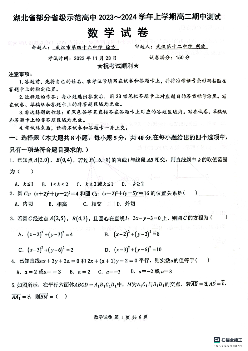 湖北省武汉市七校2023-2024学年高二上学期期中联考试题数学