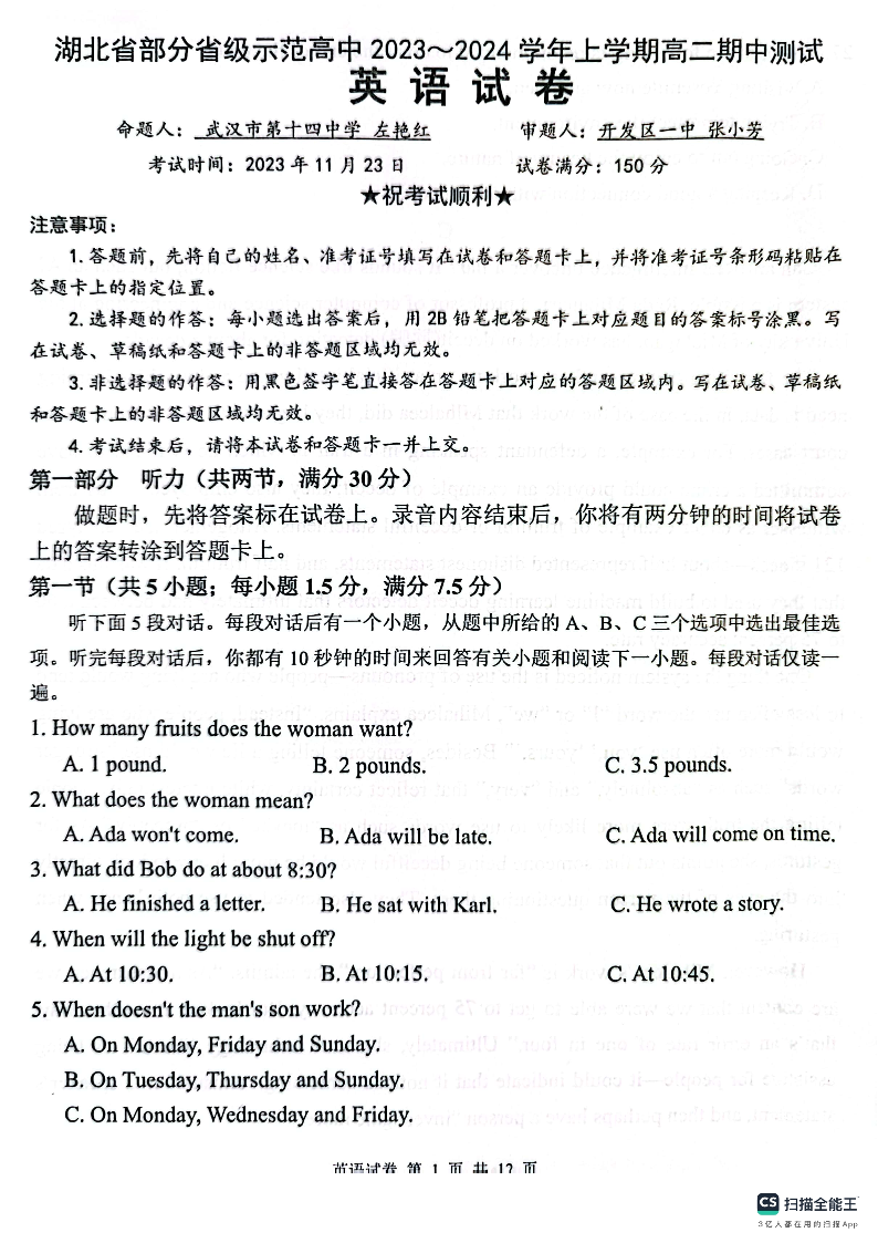 湖北省武汉市七校2023-2024学年高二上学期期中联考试题英语