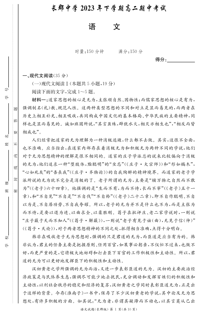 湖南省长沙市长郡中学2023-2024学年高二上学期期中考试 语文