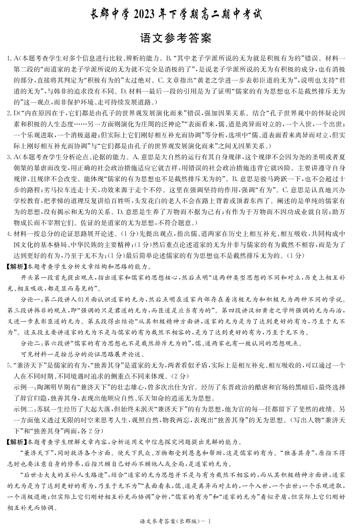 湖南省长沙市长郡中学2023-2024学年高二上学期期中考试 语文答案