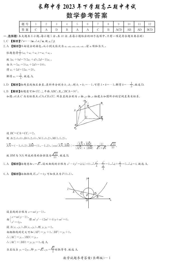 湖南省长沙市长郡中学2023-2024学年高二上学期期中考试 数学答案