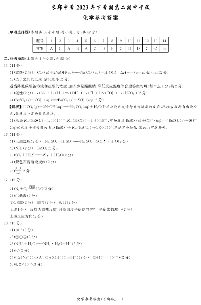 湖南省长沙市长郡中学2023-2024学年高二上学期期中考试 化学答案