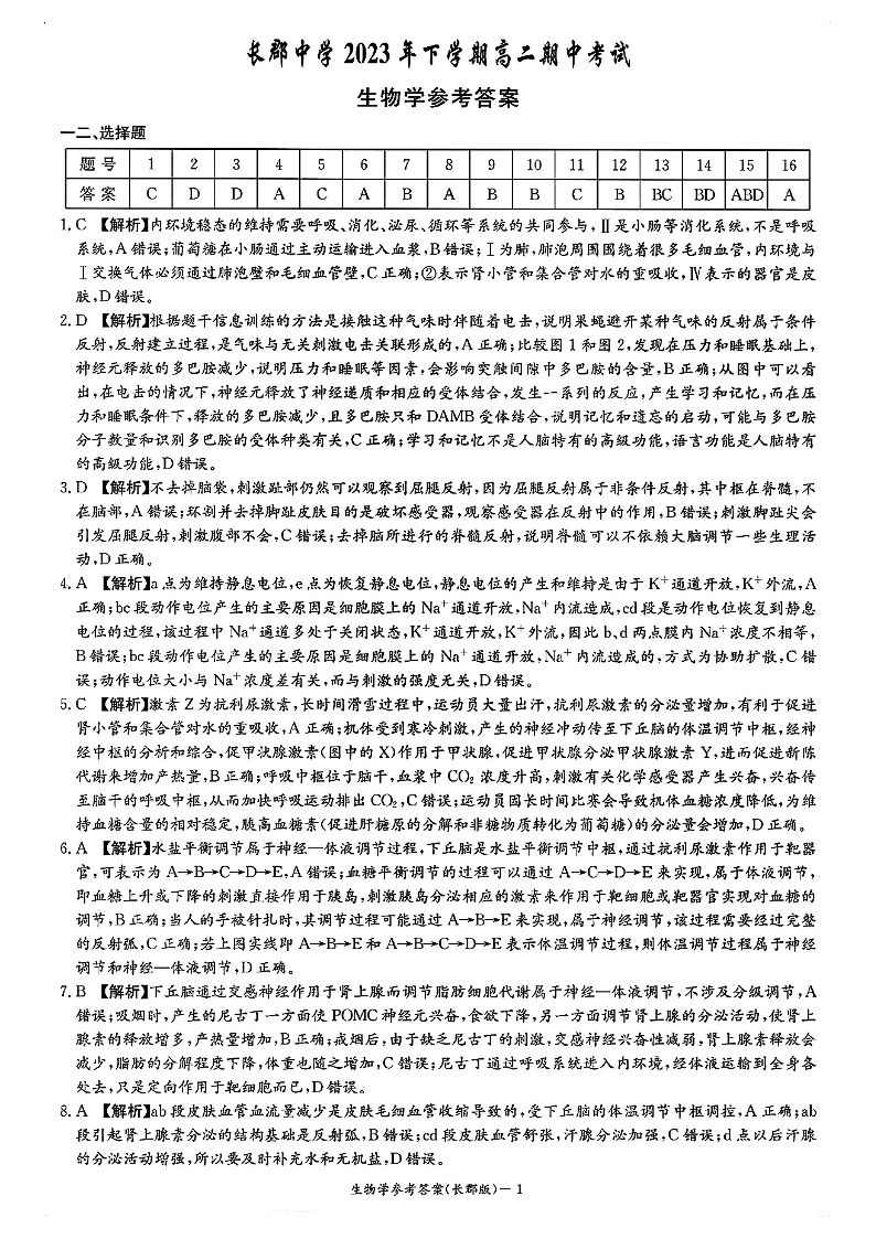 湖南省长沙市长郡中学2023-2024学年高二上学期期中考试 生物答案