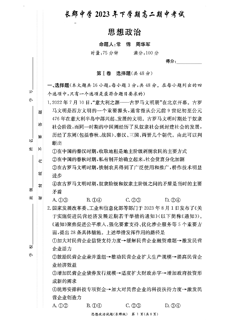 湖南省长沙市长郡中学2023-2024学年高二上学期期中考试 政治