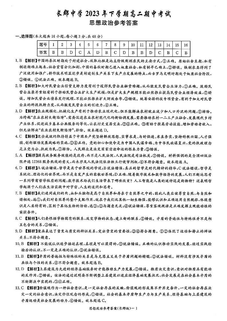 湖南省长沙市长郡中学2023-2024学年高二上学期期中考试 政治答案