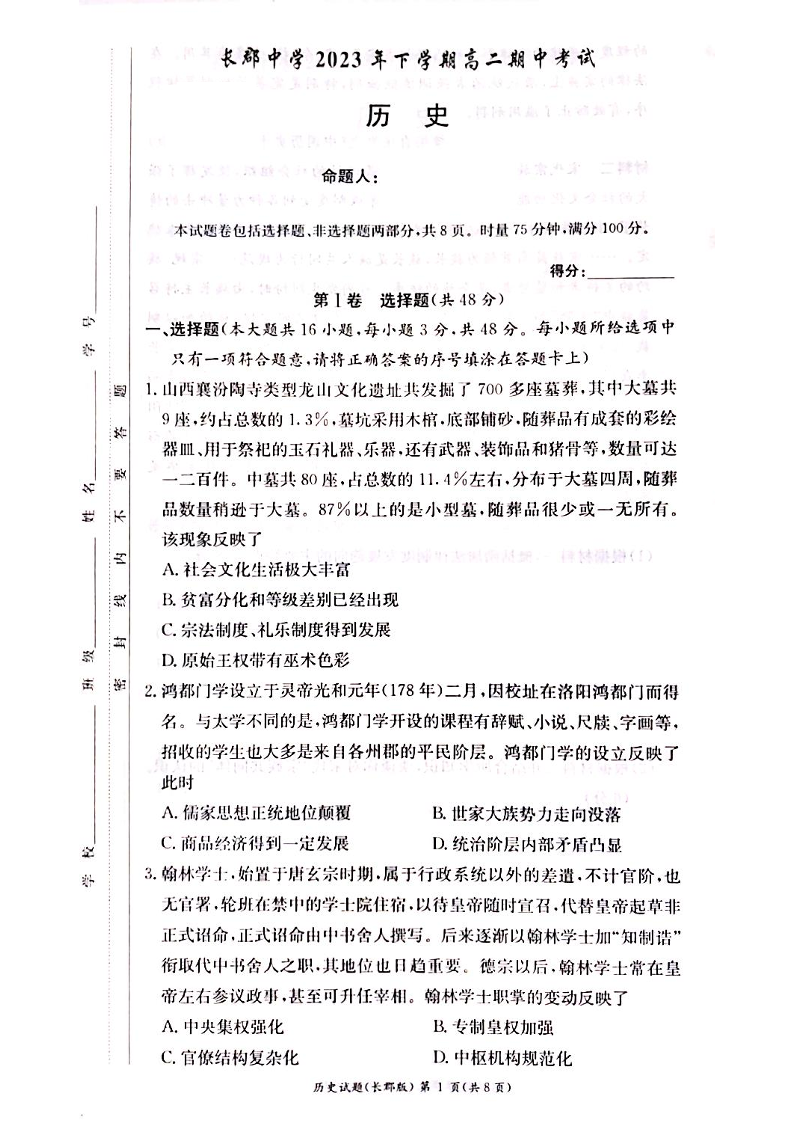 湖南省长沙市长郡中学2023-2024学年高二上学期期中考试 历史